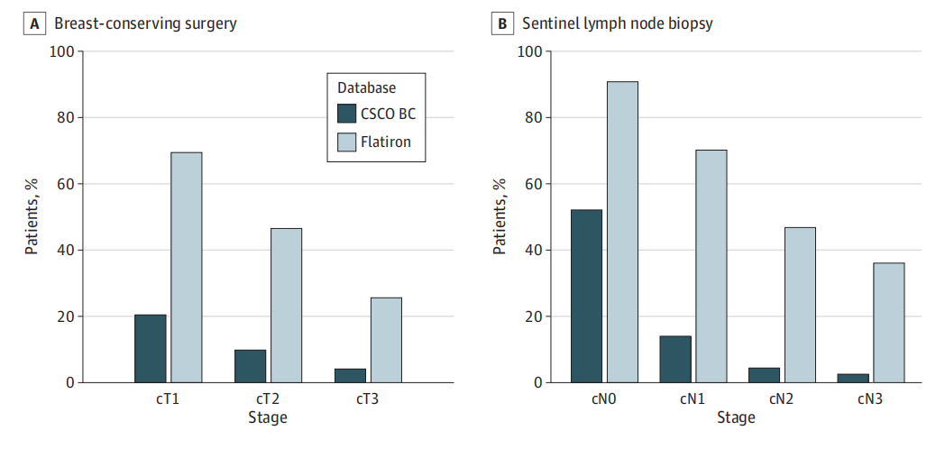 图2.根据乳腺癌临床分期患者接受保乳手术(A)与前哨淋巴结活检(B)的比例