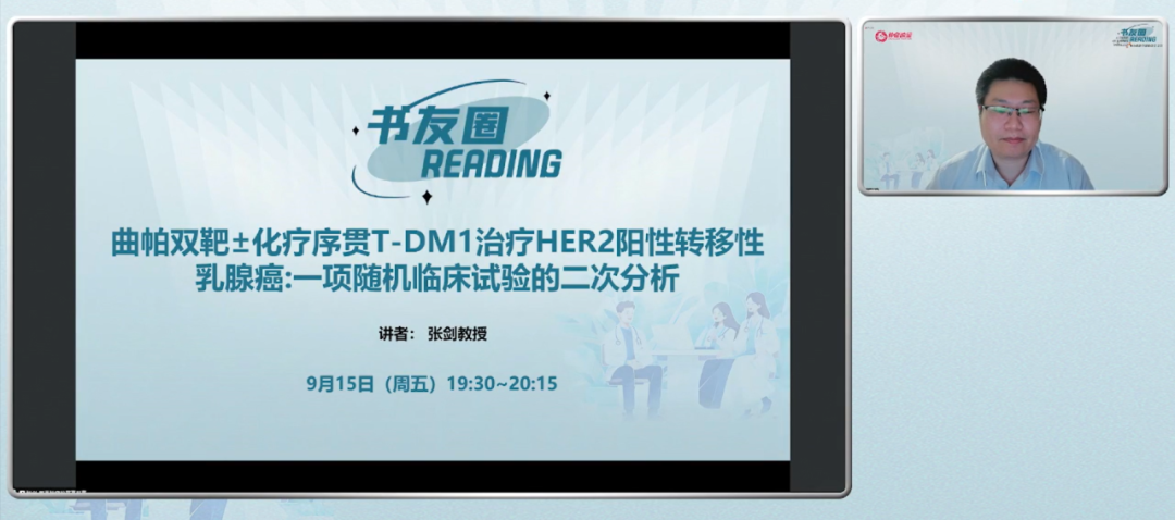 2023年9月15日19:30,《书友圈》第四期开播,北京大学人民医院王殊教授(主持)与复旦大学附属肿瘤医院张剑教授(讲者)、北京大学肿瘤医院范照青教授(讲者)共同做客《书友圈》,针对HER2阳性乳腺癌患者的降阶梯治疗进展进行了介绍和讨论。