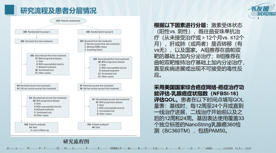 该研究为随机、开放标签的Ⅱ期临床试验,纳入法国、瑞士、荷兰和德国多个国家/地区的HER2阳性晚期乳腺癌患者为研究对象,将210例中心证实为HER2阳性的晚期乳腺癌患者按1:1随机分至A组或B组接受治疗: