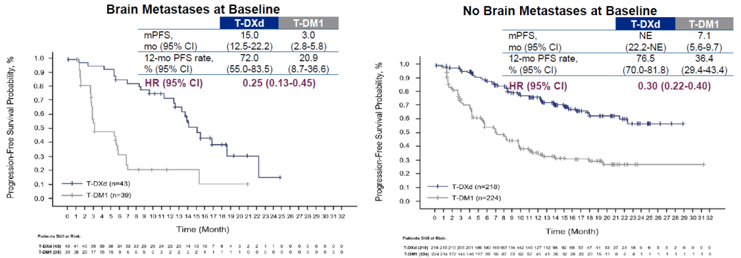 图1.DESTINY-Breast03研究中基线时伴和不伴脑转移患者的PFS