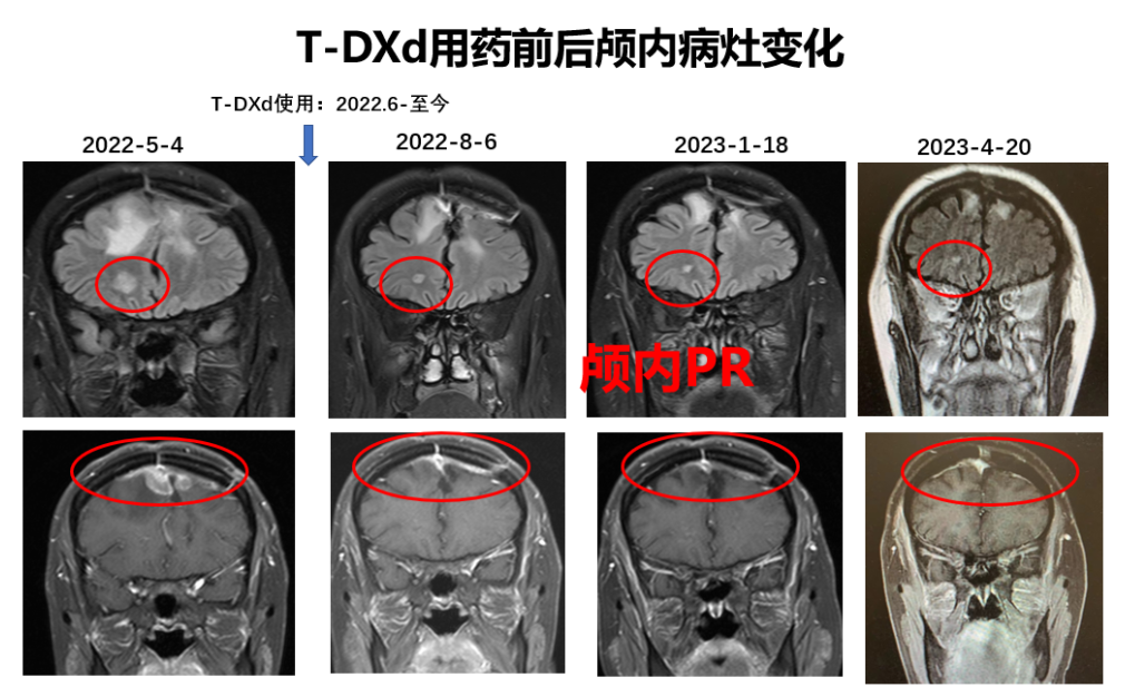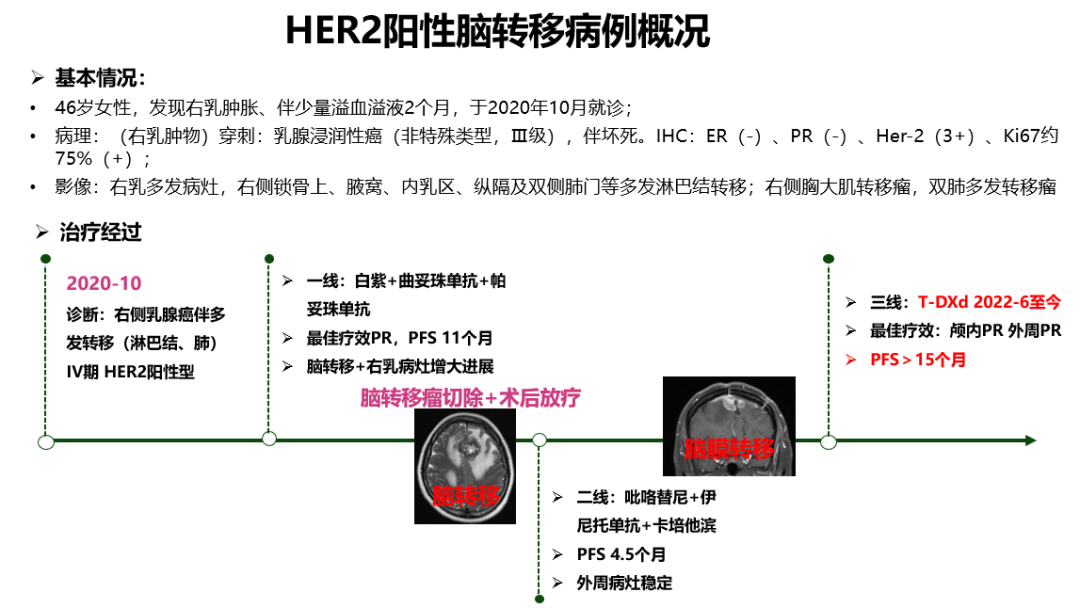 我们在临床中也见到不止一例T-DXd前线使用,对脑转移有良好疗效的病例。比如下面这个患者,单个脑转移病灶手术切除后,发生脑转移合并脑膜转移,经过MDT会诊,考虑推迟全脑放疗,采用T-DXd药物治疗,获得了持久的疗效,患者的生活质量也得到保障。