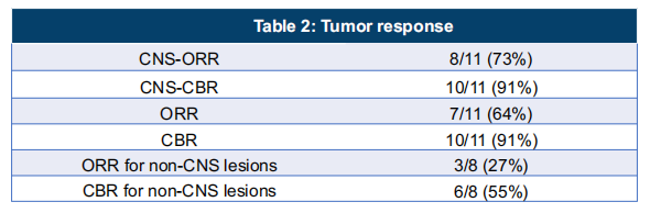 史业辉教授:2022年8月11日至2023年3月22日期间,共有17名患者入组。患者中位年龄为48岁(范围34~67岁),100%为女性。截至2023年5月5日,中位随访周期为6个周期(2~8)。65%(11/17)的患者疗效可评估,CNS-ORR为73%(8/11),CNS-CBR为91%(10/11),目前中位PFS和OS尚未达到,所有患者均仍在接受治疗。符合进入第二阶段标准。