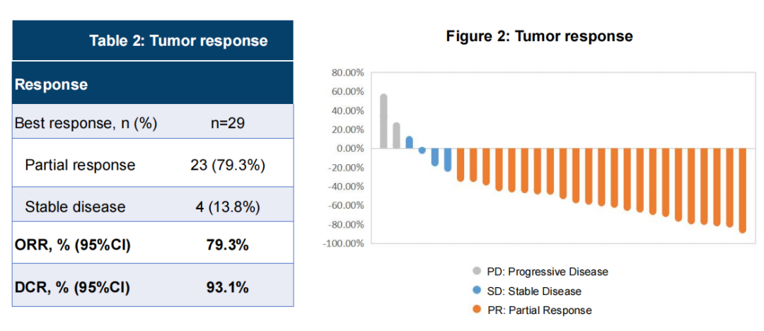截至2023年4月1日,我们纳入了47例患者,其中29例患者可评估疗效,中位治疗周期为8(4~20)个周期,19例(65.5%)患者接受过一线治疗,10例(34.5%)患者接受过二线治疗。在29例可评估疗效和安全性的患者中,23例患者部分缓解(PR),4例患者病情稳定(SD),ORR为79.3%,DCR为93.1%。中位PFS尚未达到。