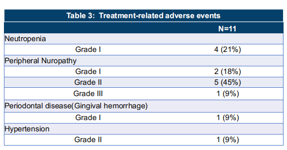 在安全性方面,大多数与治疗相关的不良反应为1级或2级,且可控可逆。3级CIPN发生率为9%(1/11)。1例患者经历优替德隆相关剂量调整,未发生治疗相关死亡。
