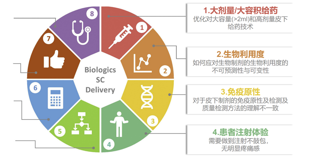 皮下给药的过程很简单,但皮下制剂的研发并不简单。著名药理学家David Macht曾说:“皮下制剂的发明是一项伟大智力成就。”[4]尽管皮下技术可追溯至19世纪中叶,但在抗肿瘤药物领域的应用却姗姗来迟。实际上,皮下制剂的研发是一种“高端”技术,因为从体外到皮下、淋巴管网,皮下药物的吸收分布相较静脉药物多了很多“弯弯绕绕”。皮下制剂的研发面临诸多挑战[5]。
