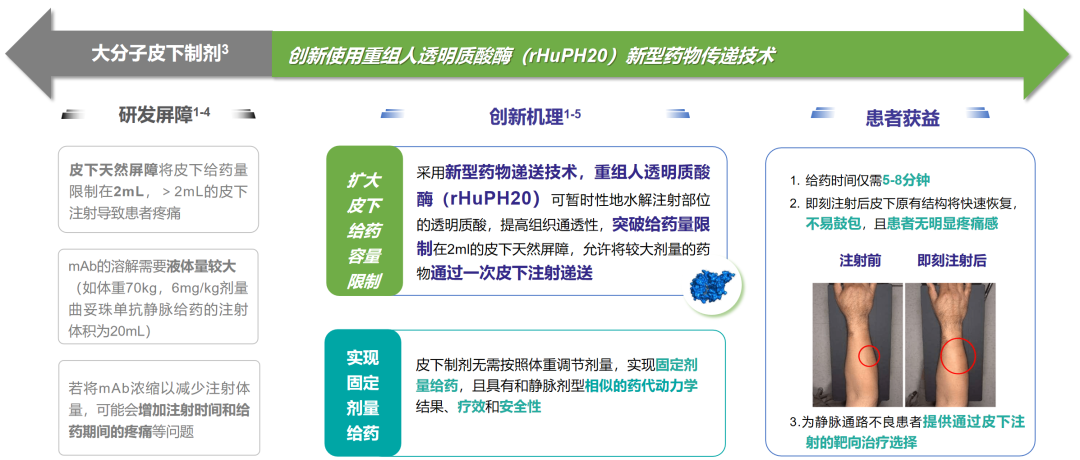 皮下曲妥珠单抗的成功研发突破了皮下给药的技术瓶颈,创新使用重组人透明质酸酶(rHuPH20)新型药物传递技术。rHuPH20如同“溶解剂”,可暂时性地水解注射部位的透明质酸,提高组织通透性,从而突破了皮下天然屏障2mL给药量的极限,允许将较大剂量的药物通过一次皮下注射递送,“大剂量给药”和“鼓包”问题迎刃而解;而且皮下制剂中的rHuPH20没有免疫原性,不会引起炎症反应或血管通透性改变。
