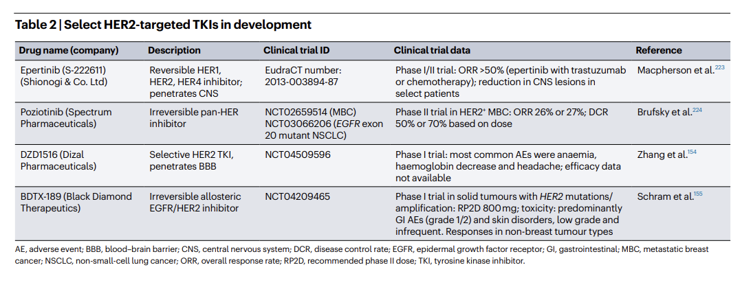 抗HER2 TKIs是以肿瘤细胞内HER2信号转导通路中催化激酶域为靶点的小分子药物,可与ATP竞争,阻断磷酸化并激活下游信号级联反应。常用的抗HER2 TKIs有拉帕替尼、奈拉替尼、吡咯替尼、图卡替尼)等。因此类药物具有透过血脑屏障的特性,临床中备受青睐,如今,数种抗HER2 TKIs正在开发中,如DZD1516、BDTX-189等(见表2)。