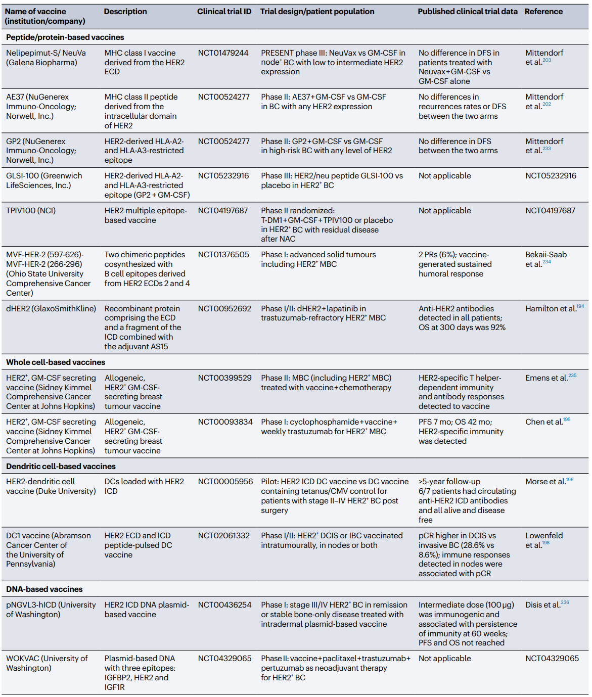 癌症疫苗旨在激发患者自身的免疫系统,通过刺激CD+8和CD4+T细胞对肿瘤特异性抗原的反应,来识别和杀灭肿瘤细胞[5]。正在设计的针对HER2的癌症疫苗包括多肽疫苗、蛋白质疫苗、细胞疫苗、树突细胞(DC)疫苗、基于DNA或病毒的重组疫苗(表3)。