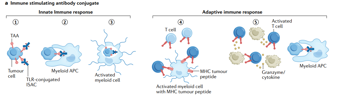 抗体-免疫刺激偶联物(ISACs)将免疫刺激剂羽肿瘤特异性抗体共价结合,可触发先天性和适应性免疫系统的靶向肿瘤依赖性激活,从而根除肿瘤(图5)[8]。如BDC-1001由不可裂解的连接子将TLR7/8激动剂与曲妥珠单抗类似物共价结合,同时存在曲妥珠单抗介导的直接抗肿瘤作用、由TLR7/8激动剂激活髓系抗原呈递细胞(APC)后对HER2过表达细胞是吞噬和消除作用。本质上,ISACs通过局部刺激免疫系统将TME从“冷”变“热”,从而发挥免疫治疗效果。表3列出了其他正在开发曲妥珠单抗及其类似物与TLR7/8偶联的ISACs。