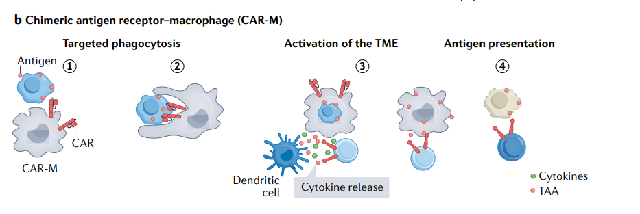 嵌合抗原受体(CARs)是一种结合抗体特异性和T细胞下游信号的工程分子,是细胞免疫疗法的一个关键类别。尽管FDA批准的CAR-T疗法可用于血液系统恶性肿瘤,但由于需要主动运输和渗透才能使T细胞送至TME,故其在实体肿瘤中的应用存在阻碍。将免疫细胞予以替换是一种有效的改进途径。CAR-Ms(如CT-0508)可将旁观免疫抑制的M2巨噬细胞转化为促炎的M1巨噬细胞,上调APC机制,并通过激活未成熟的DCs、募集活化的CD8 T细胞改写TME,从而增强抗肿瘤反应(图7)。CAR-NK细胞(如CT-179)可作为针对肿瘤相关抗原(TAAs)的受体,将效应NK细胞靶向募集至特定肿瘤细胞,进而通过多种机制产生细胞毒性,且不会诱发细胞因子风暴(CRS),又因为它们可以来源于外周血细胞、干细胞或NK-92细胞系,因此可能较CAR-T更具优势[10]。