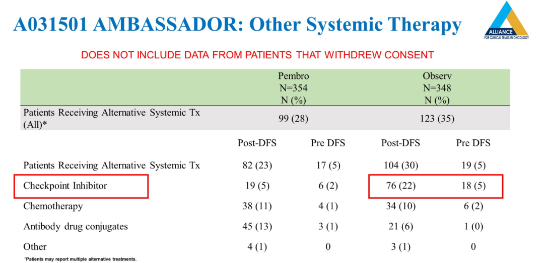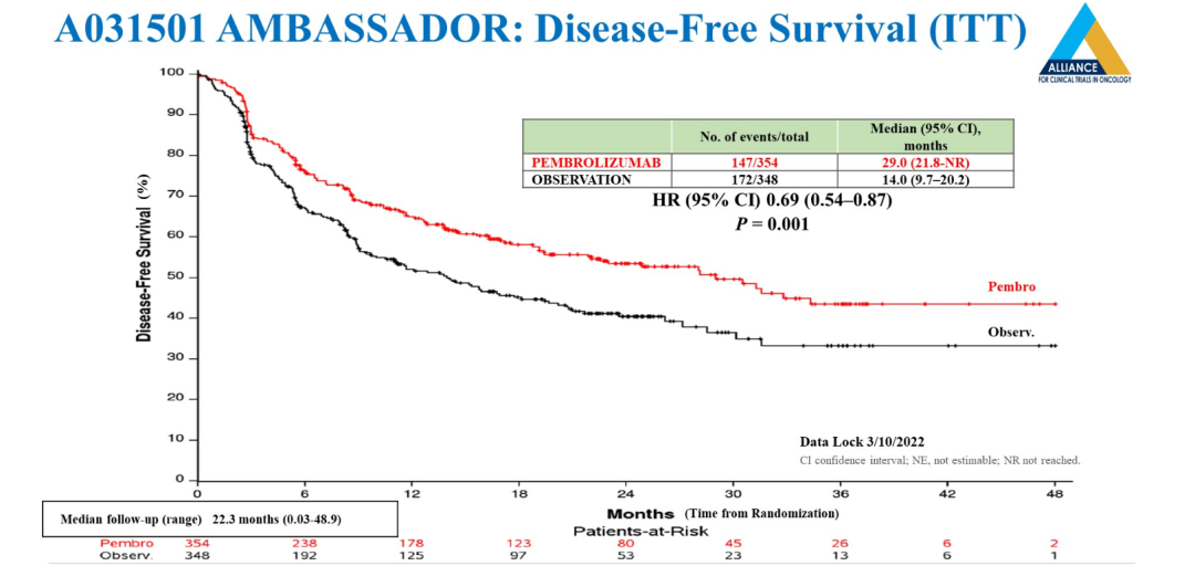 Dr.Andrea B.Apolo:该研究的DFS终点是有阳性结果的,中位随访22个月时,显示使用帕博利珠单抗辅助治疗的中位DFS为29个月,而对照组为14个月,风险比为0.69,(表明帕博利珠单抗)是术后持续性疾病患者的一种潜在治疗方法。这与纳武利尤单抗目前在美国获得批准的适应症一致,表明帕博利珠单抗是另一种可行的选择。