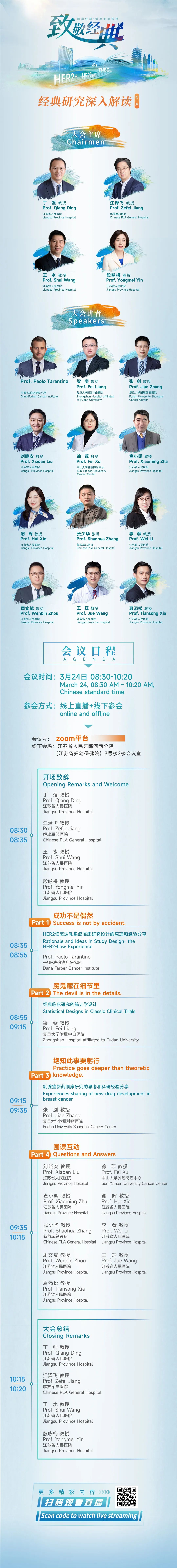 2024年3月24日08:30~10:20,首期“致敬经典——围读经典·续写命运传奇”栏目将以线上直播+线下的形式举行,并将针对乳腺癌的经典临床研究进行深入解读。本次直播会议由江苏省人民医院丁强教授、解放军总医院江泽飞教授、江苏省人民医院王水教授、江苏省人民医院殷咏梅教授共同担任大会主席,四位主席将为我们重点介绍几项具有代表性的乳腺癌经典临床研究,这些临床研究不仅具有里程碑式的意义,而且为乳腺癌的治疗提供了重要的依据和参考。通过对这些研究的深入剖析,我们可以更好地理解乳腺癌临床研究的设计原理、构思和统计学意义等,同时也能为其他恶性肿瘤研究设计提供启示和借鉴。