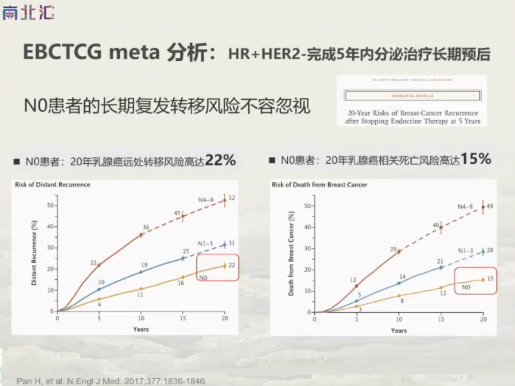 既往大家认为HR+/HER2-N0的患者预后较好。但EBCTCG的meta分析数据显示[1],这部分人群仍然具有长期复发转移风险,20年乳腺癌远处转移风险高达22%,20年乳腺癌相关死亡风险高达15%,且复发风险随肿瘤增大和组织学分级升高而进一步增加。因此,这部分人群的复发风险不容忽视。
