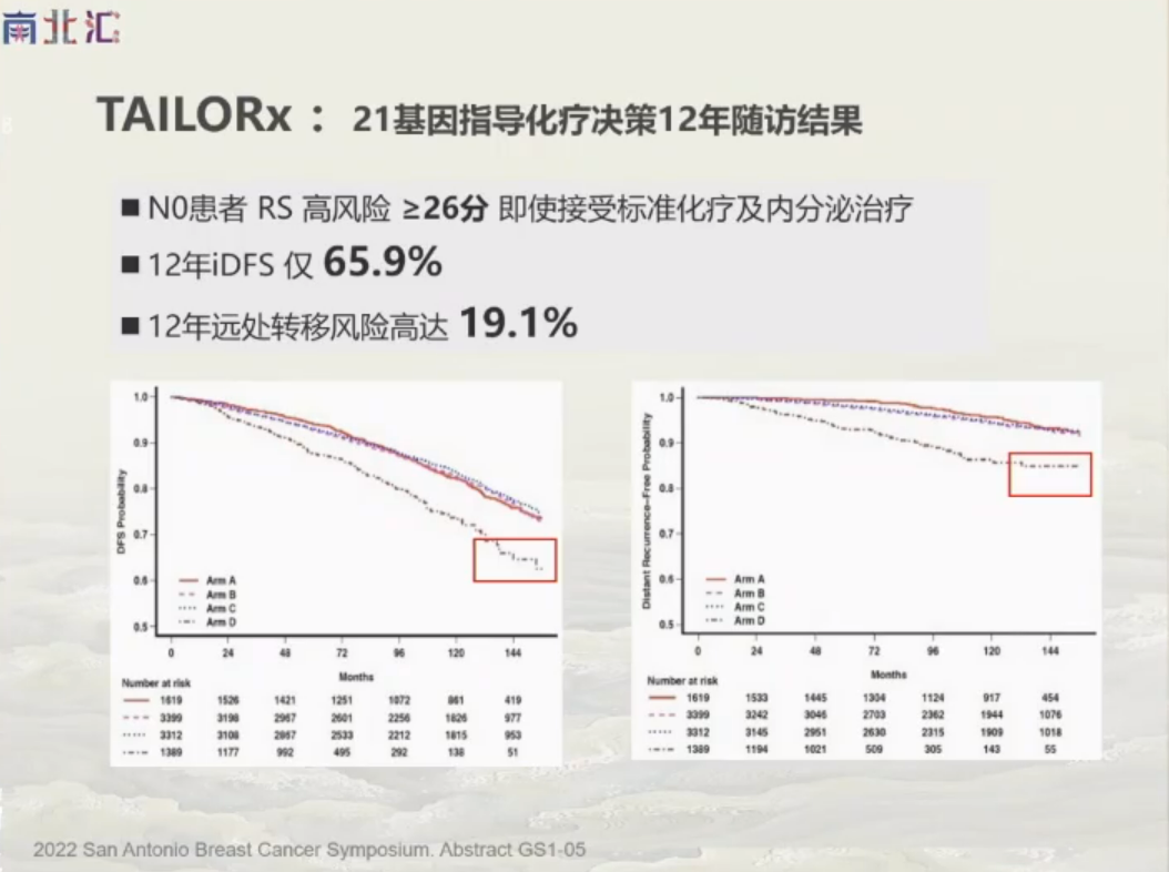 TAILORx研究12年随访结果显示[2],N0患者复发评分(RS)≥26分,即使接受标准化疗和内分泌治疗,12年无浸润性疾病生存(iDFS)率仅为65.9%,12年远处转移风险高达19.1%。因此,对于预后不佳的N0伴有限高危因素患者,需要拓展除化疗和内分泌治疗之外的其他辅助治疗。