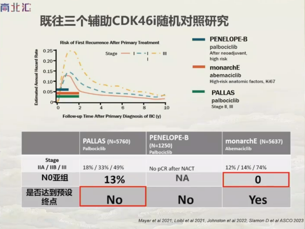 胡泓教授表示,对于这一问题,2023年6月份之前我的答案是否定的。因为既往的CDK4/6i辅助随机对照研究中,很少入组该亚组人群。PALLAS研究[3]虽然入组了少部分N0亚组,但研究结果为阴性。monarchE[4]虽然取得了阳性结果,但未入组任何N0的亚组人群。