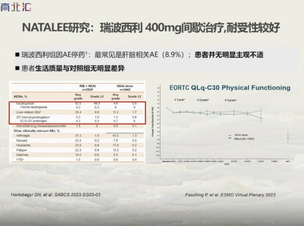胡泓教授指出,NATALEE研究的安全性结果显示,在瑞波西利400mg的3年辅助治疗中,患者安全性良好、耐受性较好,未发现新的安全信号,瑞波西利组患者生活质量与对照组无明显差异。可见这种获益并未付出巨大代价,患者的治疗耐受性也较好。