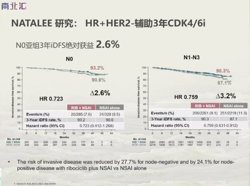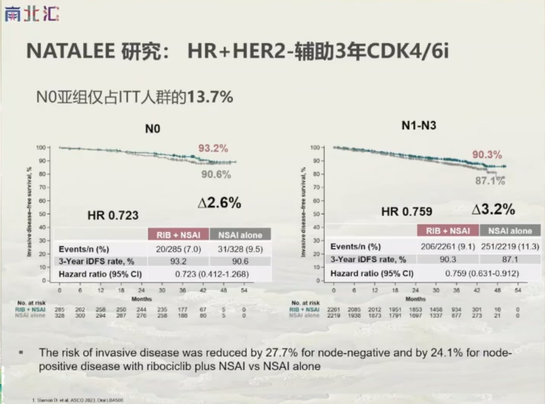 2023 SABCS大会进一步披露了NATALEE研究最终的iDFS数据[6],结果显示,瑞波西利+非甾体芳香酶抑制剂(NSAI)组和NSAI组3年的iDFS率分别为90.7%(95%CI:89.3%~91.8%)和87.6%(95%CI:86.1%~88.9%),瑞波西利治疗组获得了3.1%的绝对获益,期待今后其转换为总生存期(OS)和远处转移生存的获益。此外,NATALEE研究中,各亚组获益与整体意向治疗(ITT)人群保持一致,其中也包含N0亚组。N0亚组3年iDFS绝对获益可达2.6%,与淋巴结阳性患者的获益非常接近。