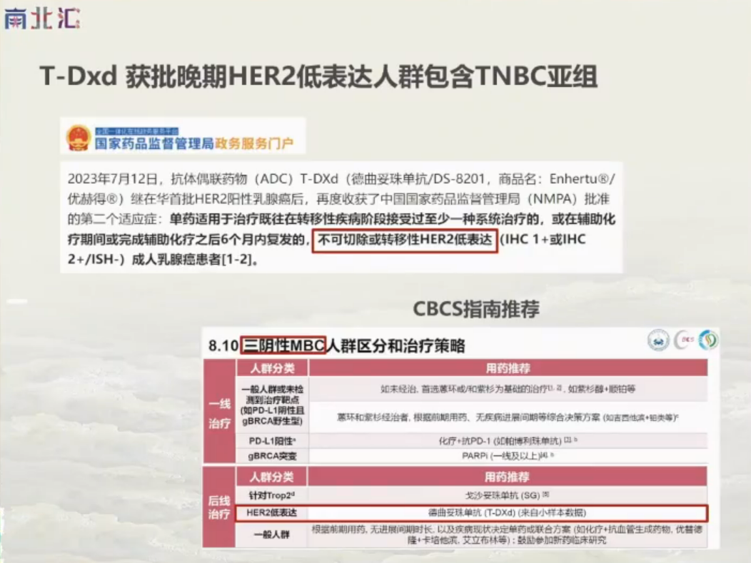 DESTINY-Breast04是首个针对HER2低表达人群进行的Ⅲ期临床试验,证实了无论HR状态如何,T-DXd均能为HER2低表达乳腺癌患者带来具有临床意义和统计学意义的PFS和OS改善[9]。该研究中HR-亚组仅入组58例,约占ITT人群的10%,但在研究中仍然可以看到T-Dxd治疗组获益趋势与ITT人群一致。因此,T-Dxd被获批用于治疗既往在转移性疾病阶段接受过至少一种系统治疗的,或在辅助化疗期间或完成辅助化疗之后6个月内复发的,不可切除或转移性HER2低表达(IHC1+或IHC2+/ISH-)成人乳腺癌患者,其中,HER2低表达患者也包含三阴性乳腺癌(TNBC)亚组。