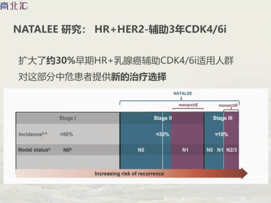 编者按:对于N0伴有限高风险的激素受体阳性/人表皮生长因子受体2阴性(HR+/HER2-)乳腺癌患者,大家都认为其复发风险较低,辅助治疗仅用内分泌治疗就足够。但随着NATALEE等研究结果的公布,可以看到,对这部分患者进行强化治疗,以减少其复发风险也很有必要。2024年南北汇上,深圳市人民医院胡泓教授带来了“HR+/HER2-乳腺癌辅助治疗:淋巴结阴性伴有限的高风险因素是否需要CDK4/6抑制剂”的讲课,本文特对讲课内容进行回顾。