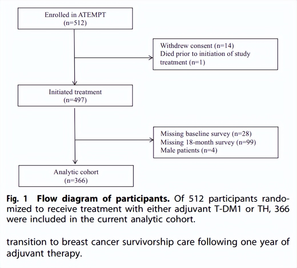 本项事后分析旨在比较ATEMPT研究中年轻(≤50岁)和老年(>50岁)女性入组后18个月的停药率、患者报告毒性和生活质量。本次事后分析在排除无基线(n=28)或18个月评估(n=99)的参与者和男性参与者(n=4)后,将T-DM1组和TH组按3:1的比例随机匹配了366例患者(图1),报告了其入组18个月后的停药情况,使用多变量模型比较按年龄、治疗组分层后的患者报告的毒性和生活质量(QOL)。