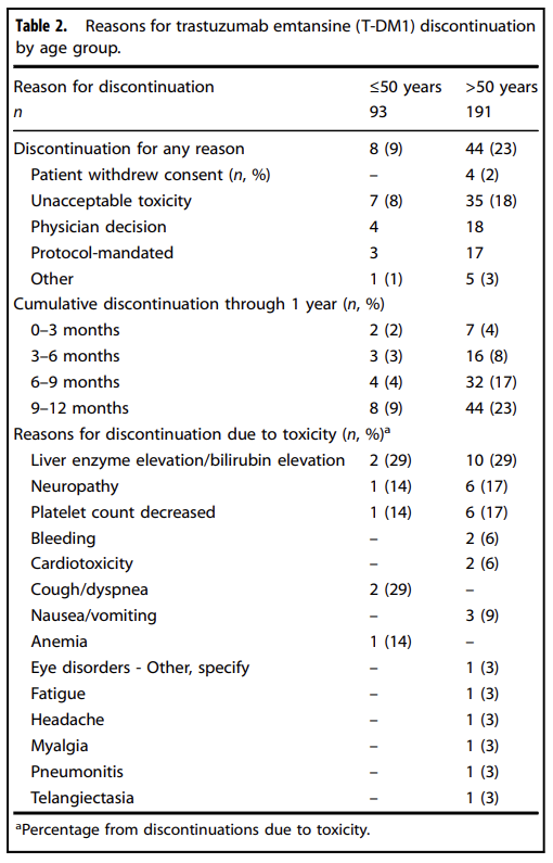 Sella T,Zheng Y,Tayob N,et al.Treatment discontinuation,patient-reported toxicities and quality-of-life by age following trastuzumab emtansine or paclitaxel/trastuzumab(ATEMPT).NPJ Breast Cancer.2022;8(1):127.Published 2022 Nov 30.doi:10.1038/s41523-022-00495-x