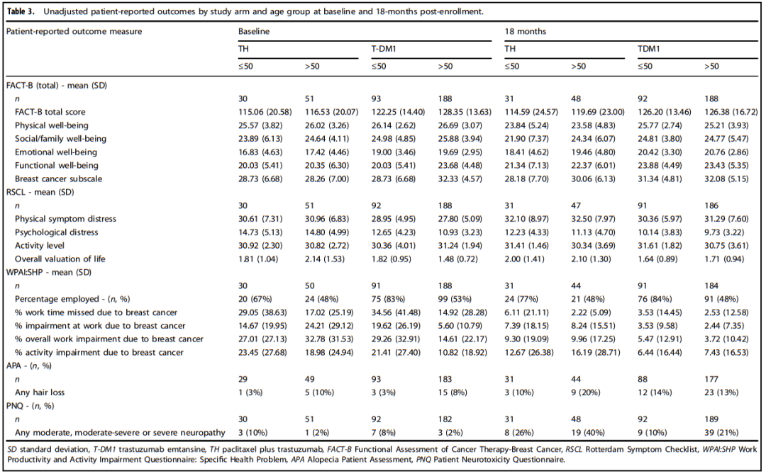 鉴于HER2阳性早期乳腺癌相关试验中良好的治疗结果,目前越来越强调降阶梯治疗是保持治疗效果同时优化生活质量(HRQOL)的一种手段。本研究结果显示与TH相比,T-DM1治疗的年轻女性18个月HRQOL更优,表明现代的、降级的治疗方案能缓和治疗对年轻女性HRQOL的影响。同时,年轻乳腺癌患者可能比老年患者更能从T-DM1的使用中获益。而对于老年患者,尽管T-DM1与更好的身体健康、更少的活动障碍和更低的神经病变几率相关,但本研究并未观察到两组之间18个月整体HRQOL的显著差异。这可能与老年患者毒性增加、T-DM1停药率升高有关。因此,在对HER2阳性乳腺癌选择降阶梯治疗方案时,要谨慎考虑该方案以及患者年龄可能对治疗耐受性、毒性和随后的生活质量的影响,以争取为患者提供当下最大治疗获益。