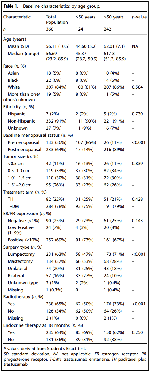 在分析队列(N=366)中,总体中位年龄为56.69(23.2-85.9)岁,≤50岁组中位年龄为45.37(23.2-50.9)岁,>50岁组为61.13(51.2-85.9)岁(图2)。治疗分布相似且符合3:1分配,75%的≤50岁患者和79%的>50岁患者纳入T-DM1组。≤50岁组在入组时绝经前患者更多(86%vs.11%,P<0.001);≤50岁组接受乳房切除术比例更高(53%对28%,P<0.001),辅助放疗比例更低(50%对73%,P<0.001)。