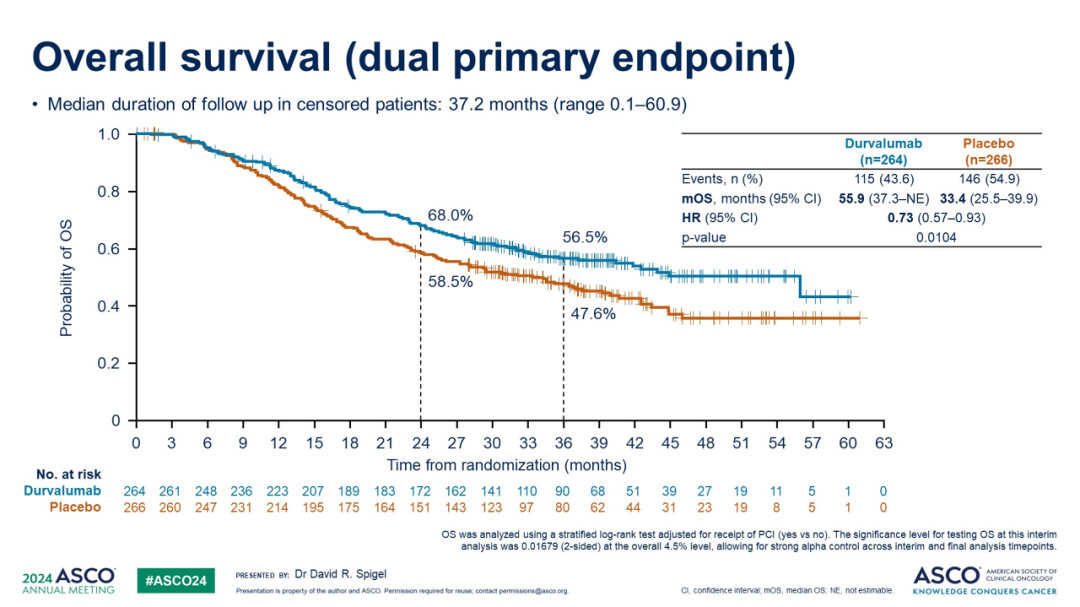 ADRIATIC研究显示,度伐利尤单抗治疗可使LS-SCLC患者的OS和PFS均获得统计学显著且具有临床意义的改善。OS风险比为0.73,相当于死亡风险降低27%,在3年多的随访后,P值为0.0104。度伐利尤单抗组的中位OS为55.9个月,而安慰剂组为33.4个月,OS优势近2年;3年OS率分别为56.5%和47.6%。度伐利尤单抗治疗的OS获益在所有预设亚组中一致,无论是基于年龄、性别、种族、所用化疗方案、放射计划或是否接受PCI的分组。