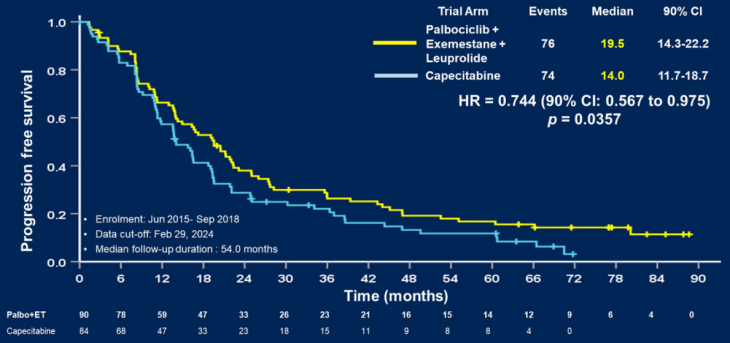 [1]Yeon Hee Park,et al.Palbociclib plus exemestane with GnRH agonist vs capecitabine in premenopausal patients with HR+/HER2-metastatic breast cancer:Updated survival results of the randomized phase 2 study Young-PEARL.ASCO 2024.Abstract LBA1002