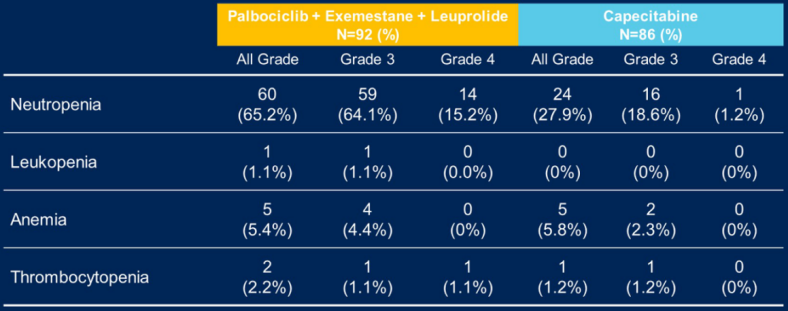 Dr.Yeon Hee Park:Certainly.The study showed that the palbociclib arm had manageable toxicity,primarily hematologic,which was not severe in most cases.On the other hand,the Capecitabine arm exhibited different toxicity profiles,including diarrhea and hand-foot syndrome,which were also well managed over time.The addition of CDK4/6 inhibitors,like Palbociclib,showed beneficial effects without introducing significant new toxicities.
