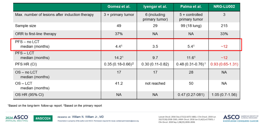 NRG-LU002研究的主要终点PFS无获益,而毒性反应有所增加。PFS HR为0.93,OS HR为1.05,均无统计学意义,尽管LCT组的局部复发和新发病灶呈延缓趋势。LCT组发生的≥2级AE(84%vs 73%)、≥3级肺炎(10%vs 1%)更多。