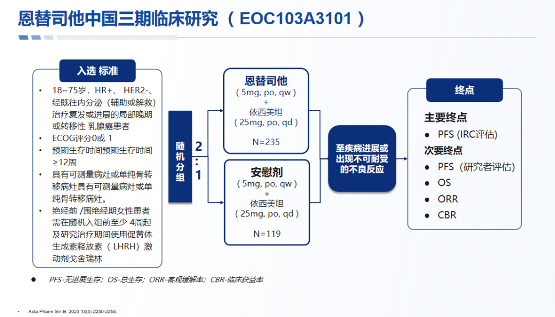 为了验证恩替司他在中国乳腺癌患者中的疗效和安全性,我国学者开展了Ⅲ期临床试验(EOC103A3101)[20]。该试验纳入了18~75岁、HR+/HER2-、既往经内分泌治疗复发或进展的局部晚期或转移性乳腺癌患者,按照2:1的比例随机分配至恩替司他组或安慰剂组,并联合依西美坦进行治疗。
