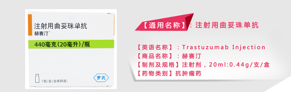 【药物毒理】:曲妥珠单抗是一种重组DNA衍生的人源化单克隆抗体,特异性地作用于人表皮生长因子受体-2(HER2)的细胞外部位。此抗体含人IgG1框架,互补决定区源自鼠抗p185HER2抗体,能够与HER2绑定。HER2原癌基因或C-erbB2编码一个单一的受体样跨膜蛋白,分子量185 kDa,其结构上与表皮生长因子受体相关。在原发性乳腺癌患者中观察到有25%-30%的患者HER2过度表达。HER2基因扩增的结果是这些肿瘤细胞表面HER2蛋白表达增加,导致HER2受体活化。曲妥珠单抗在体外及动物实验中均显示可抑制HER2过度表达的肿瘤细胞的增殖。另外,曲妥珠单抗是抗体依赖的细胞介导的细胞毒反应(ADCC)的潜在介质。在体外研究中,曲妥珠单抗介导的ADCC被证明在HER2过度表达的癌细胞中比HER2非过度表达的癌细胞中更优先产生。
