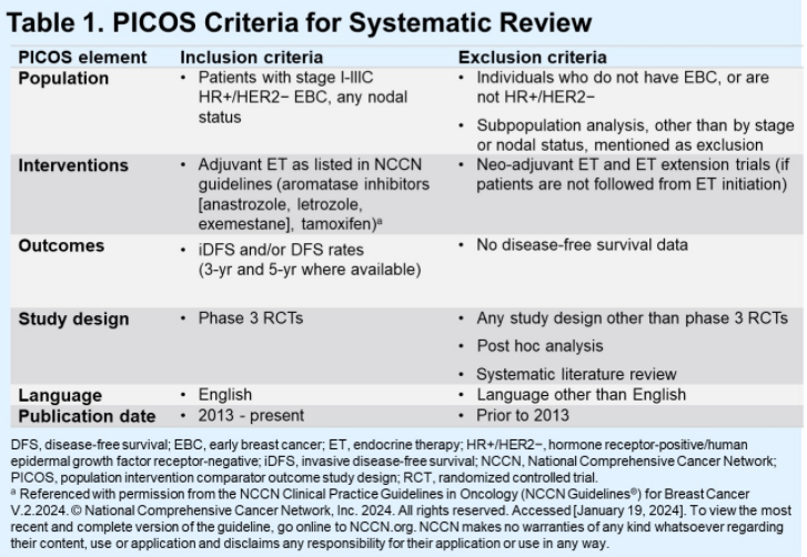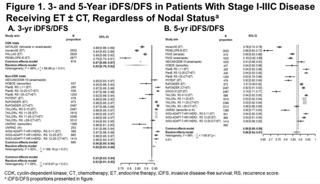 研究者对已发表的HR+/HER2-早期乳腺癌患者辅助ET治疗试验(2013年或之后)进行了系统性文献回顾,确定了符合研究标准的RCT试验:包括HR+/HER2-EBC患者的Ⅲ期试验,患者接受5年的辅助ET(芳香化酶抑制剂±卵巢抑制或他莫昔芬)±CT,并报告了随机化后3年或5年的浸润性无病生存期(iDFS)或无病生存期(DFS)。排除了新辅助或延长的ET试验。年龄、淋巴结状态、分级、绝经状态、基因组风险评分和辅助治疗(如果有)的数据从特定研究中提取。