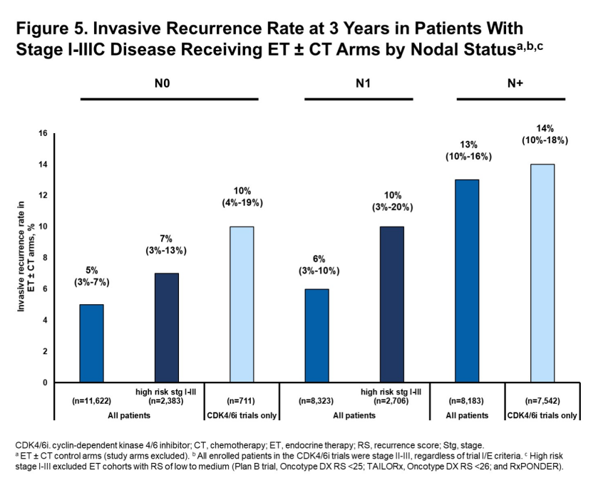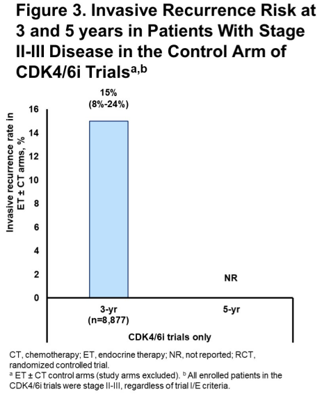 在包括Ⅱ-Ⅲ期患者(n=8877)的4项CDK4/6i试验中,ET±CT组3年RoR为15%;5年风险未报告。