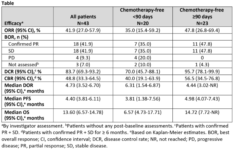 疗效分析(n=43)显示,ORR为41.9%,CBR为48.8%(表1)。中位DoR为4.73个月(95%CI,3.52-6.70),中位PFS为4.40个月(95%CI,3.81-6.11),中位OS为13.60个月(95%CI,6.57-14.78)。铂抵抗和敏感患者的ORR分别为35.0%和47.8%。
