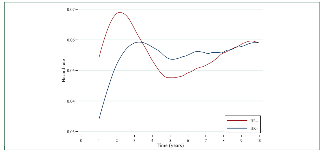 图1.对激素受体阳性/阴性患者DFS事件予以Epanechnikov kernel-smoothed年度复发风险比分析