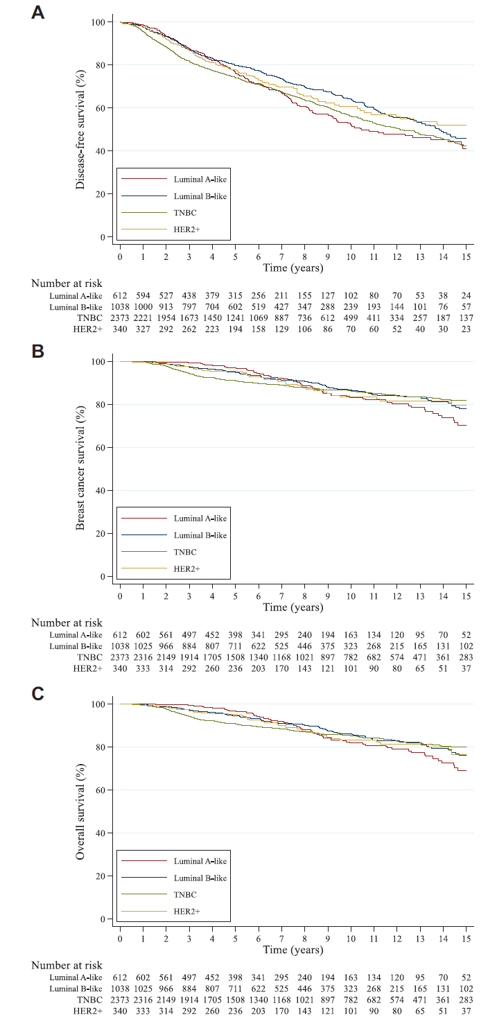 在Luminal A、Luminal B、TNBC、HER2阳性患者人群中,DFS事件依次为211(34.5%)例,332(32.0%)例,890(37.5%)例、112(32.9%)例;8年DFS率依次为60.8%、69.7%、63.5%、65.5%(图3A);8年BCSS率依次为88.7%、90.5%、87.8%、87.6%(图3B);8年OS率依次为87.8%、90.1%、87.0%、87.2%(图3C)。