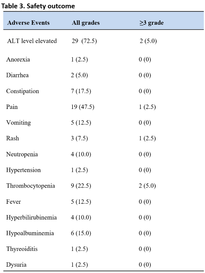 40例患者中的不良事件(AE)发生率85%,但大部分AE为0~2级;仅2例为3级AE,并且经过临床医生管理后患者可以接受后续治疗。主要AE为肝功能异常、血小板下降等。