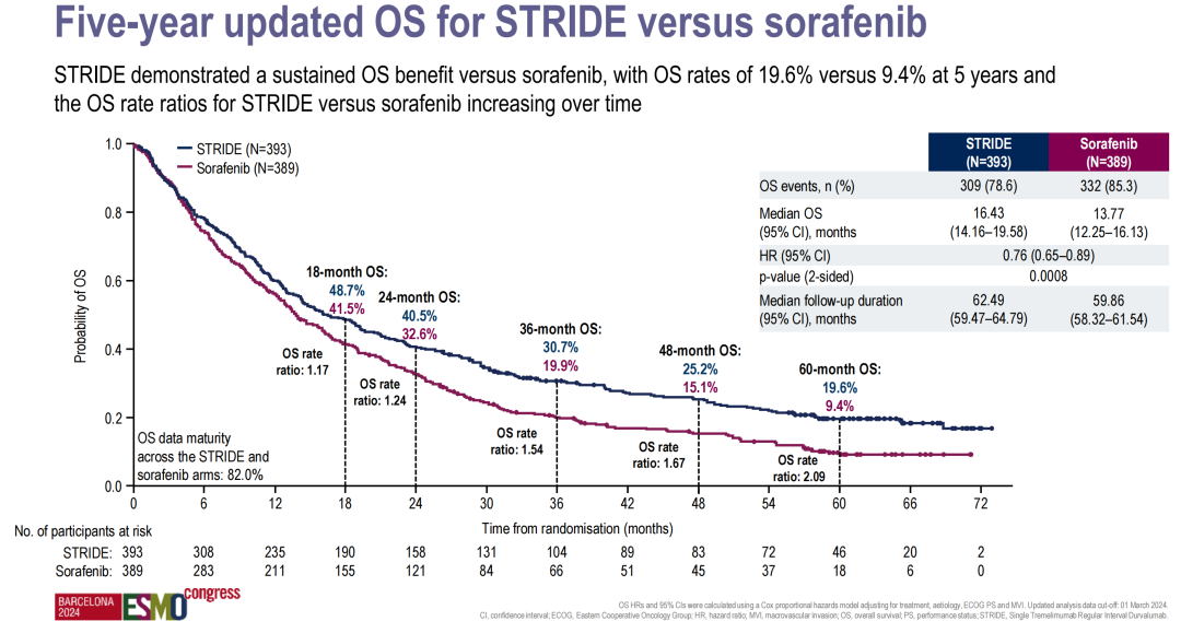 Lorenza Rimassa教授:感谢您的提问。首先,我们首次在不可切除肝癌患者的3期试验中报告了5年OS数据,这是非常重要的结果。在HIMALAYA研究的STRIDE方案组中,有19.6%的患者,即接近五分之一的患者在5年后仍然存活。这些患者接受了STRIDE方案治疗,该方案包括单剂量300mg的曲美木单抗(抗CTLA-4)作为初始治疗,随后接受400mg度伐利尤单抗(抗PD-L1)Q4W治疗。