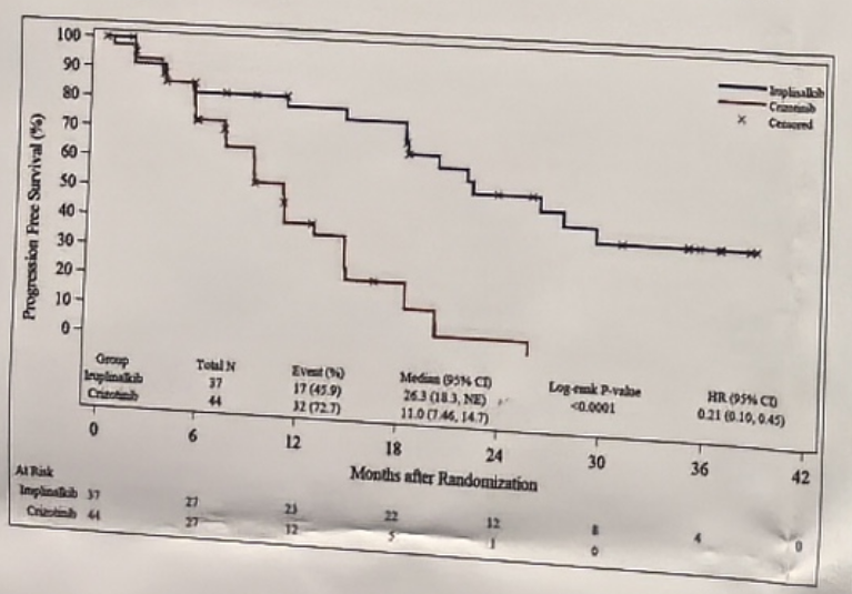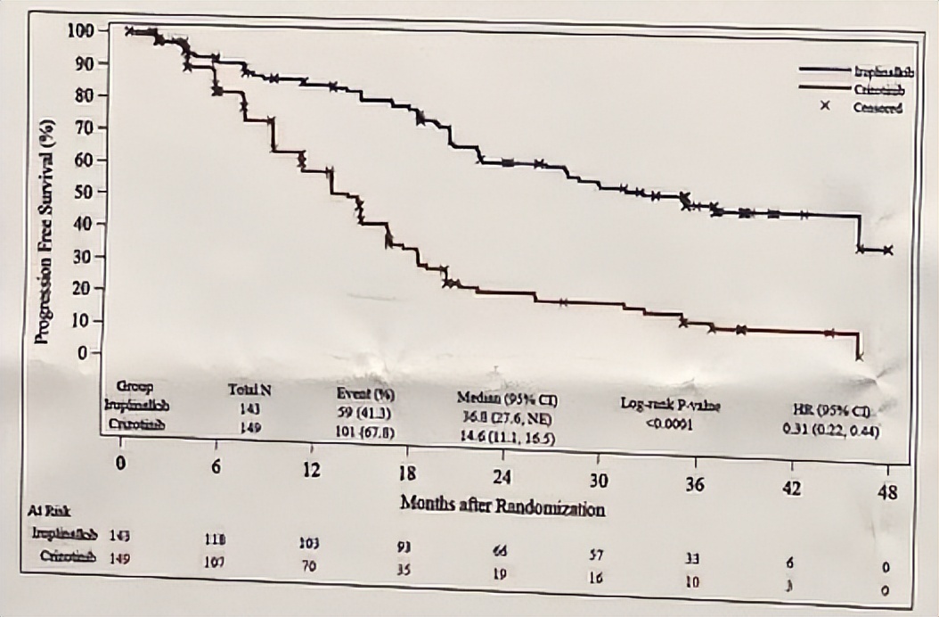 IRC评估的ALK阳性患者的中位PFS分别为45.90个月(28.32-NE)和14.55个月(11.07-16.53),HR(95%CI)为0.292(0.199-0.430)。