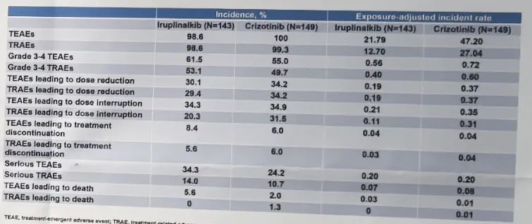 在之前报告的第一次中期分析(数据截止日期:2022年11月13日)中,伊鲁阿克组的中位随访时间为26.7个月(3.7-37.7),克唑替尼组为25.9个月(0.5-35.9)。IRC评估的PFS在伊鲁阿克组中显著延长(中位PFS为27.7个月[95%CI,26.3-NE],克唑替尼组为14.6个月[95%CI,11.1-16.5],HR,0.34[98.02%CI,0.23-0.52];P<0.0001)。IRC评估的ORR在伊鲁阿克组为93.0%(95%CI,87.5-96.6),在克唑替尼组为89.3%(95%CI,83.1-93.7)。对于基线时发生CNS转移的患者,伊鲁阿克组的颅内ORR为90.9%(10/11,95%CI,58.7-99.8),克唑替尼组为60.0%(9/15,95%CI,32.3-83.7)。3级或4级治疗相关不良事件(TRAE)的发生率在伊鲁阿克组为51.7%,在克唑替尼组为49.7%。