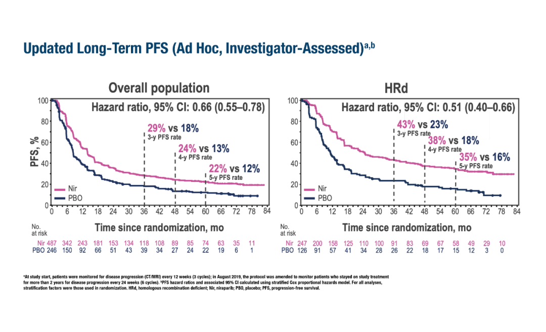 首先,PRIMA研究的长期PFS证实了在HRd人群的一线治疗中添加尼拉帕利作为维持治疗有获益,在五年内,尼拉帕利组的无进展存活患者的比例是安慰剂组患者的两倍(35%vs.16%)。因此,第一个信息是尼拉帕利一线维持治疗对HRd人群具有长期持续益处。