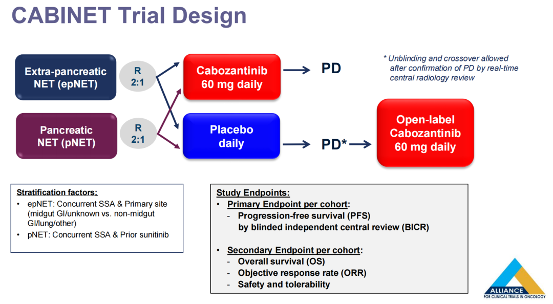 研究题目:卡博替尼对比安慰剂用于经治晚期NETs患者(CABINET试验/Alliance A021602):盲法独立中心审查(BICR)和亚组分析的无进展生存期(PFS)结果更新[1]