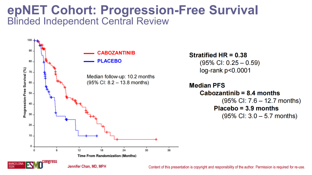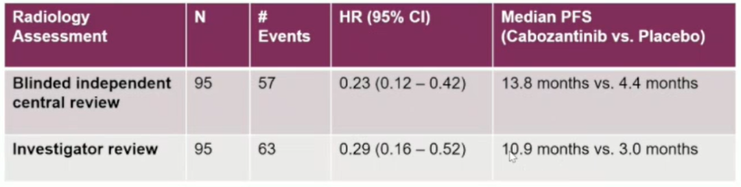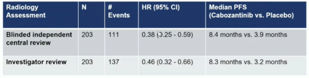 此次报告BICR评估的结果显示,epNET队列中,卡博替尼组和安慰剂组的中位PFS分别为8.4个体和3.9个月,死亡或进展风险显著降低62%(HR 0.38,95%CI:0.25-0.59,P<0.0001);各亚组的获益趋势一致。BICR和研究者评估的PFS在数值上相当。
