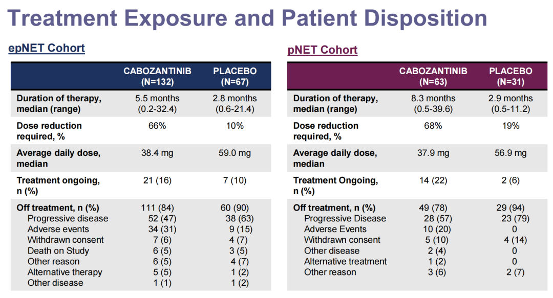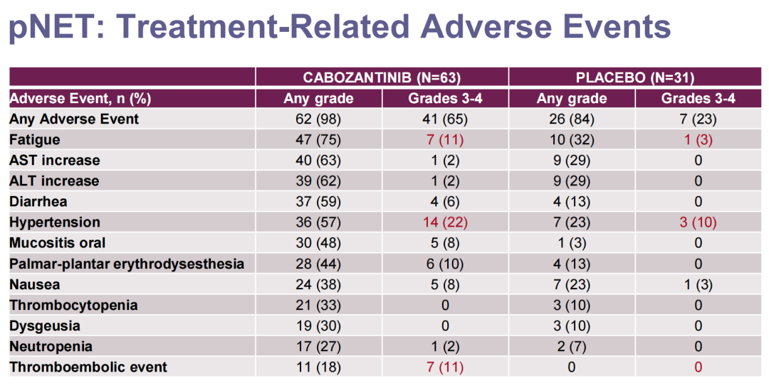 从药物暴露和治疗耐受性来看,epNET和pNET队列中卡博替尼组的减剂量比例高达66%和68%,有将近三分之二的患者可能由于药物毒副作用而需要调整治疗剂量;此外,分别有31%和20%的患者由于不良事件而停药。epNET队列患者中,较为常见的3-4级不良事件为乏力(13%)、腹泻(11%)、高血压(21%);而pNET队列患者中,较为常见的3-4级不良事件为乏力(11%)、高血压(22%)和血栓事件(11%)。