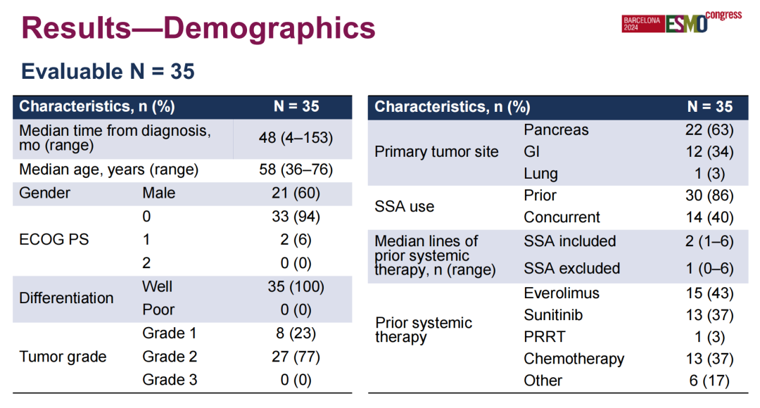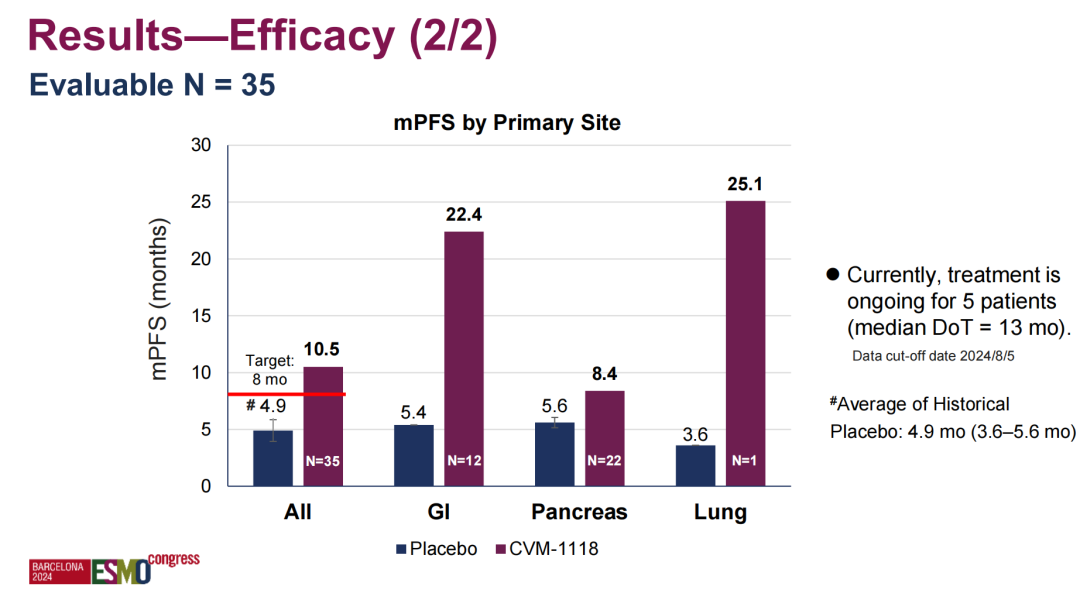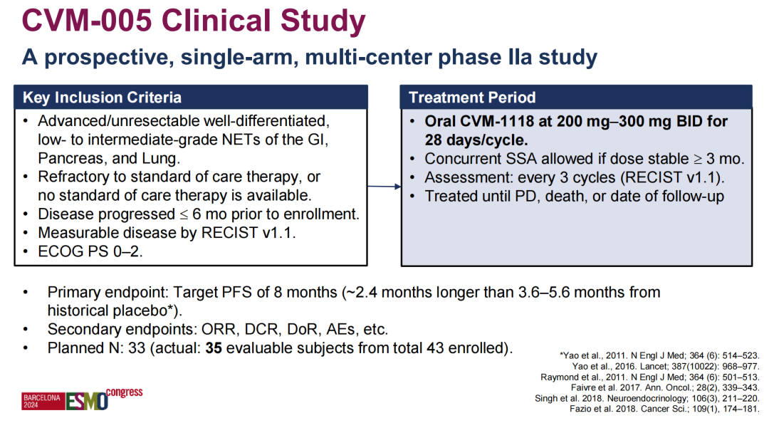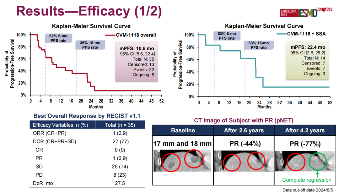 这项多中心单臂的CVM-005研究,入组了35例G1和G2的NETs(包括胃肠道63例、胰腺34例和肺3例)。这些患者既往接受过多种治疗,包括依维莫司、舒尼替尼、PRRT和化疗等,其中30例接受过SSA,14例仍在接受SSA治疗。入组后接受200—300mg的CVM-1118日二次(每周期28天)直至疾病进展或死亡。该研究预设主要终点PFS可达8个月,相较于历史对照延长3.6—5.6个月。