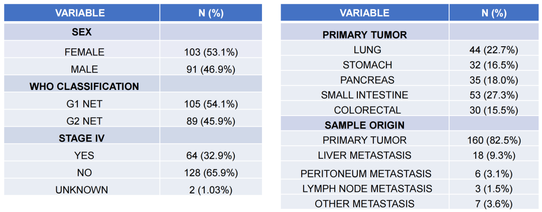 ESMO大会报道的这项研究,分析了194个来自不同原发部位的NETs患者的石蜡包埋肿瘤样本。下图所示患者临床及肿瘤样本特征,显示样本来源相对比较丰富和均衡,具有较好的代表性。