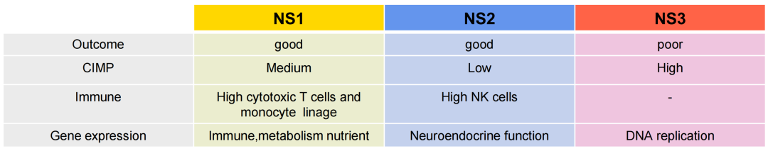 NETs的肿瘤部位和病理特征较为复杂。近年来,精准医学推动了一些NETs基因组学的研究探索,例如2019年的WHO分类中,加入了基因组学的阐述,MEN1、DAXX和ATRX突变常见于高分化NETs,而TP53或RB1突变常见于神经内分泌癌(NEC)[9]。然而,目前还没有公认的可用于指导临床诊疗的分子分型。这项研究利用多组学分析模型,从转录组学和甲基化两个层面提取相关的影响因子,通过数学算法构建了NS 1-3三种分子亚型。这种分型不仅揭示了不同原发部位NETs之间的共同生物学变异特征,而且可以很好地区分不同的预后特征。该研究对识别NETs的生物标志物以及分类治疗策略有积极意义,期待未来能够得到进一步验证和应用。