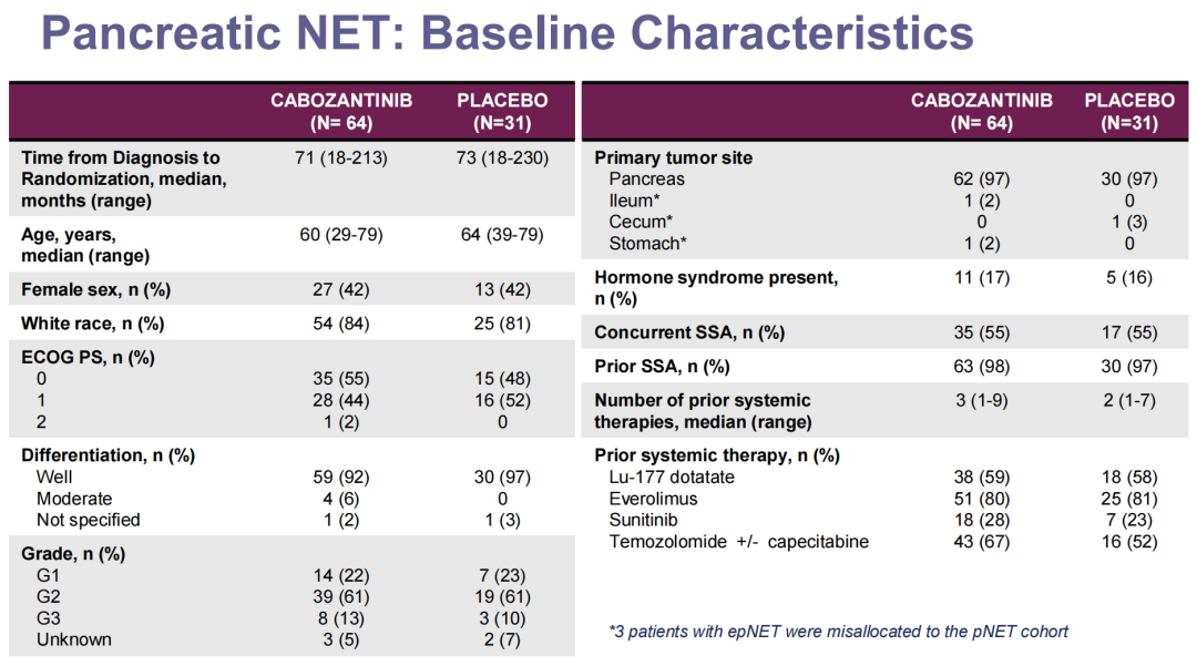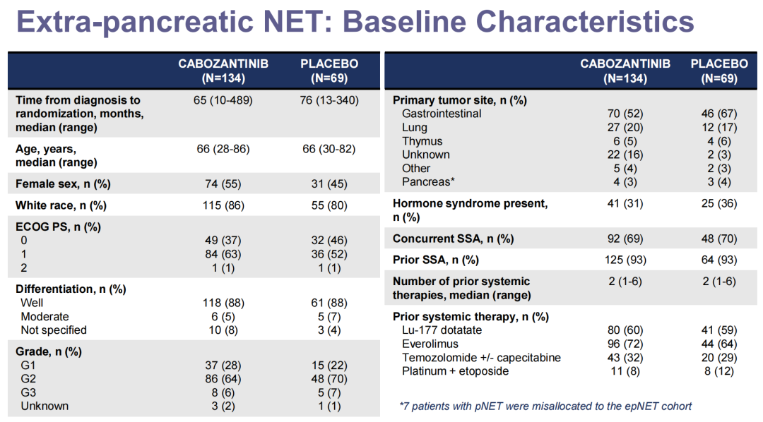 卡博替尼是一种泛靶点TKI,可靶向于VEGF-R、c-MET、AXL和RET等。CABINET与既往研究相似,同样分为胰腺NET(pNET)和胰腺外NET(epNET)两个队列;但该研究入组患者包括G 1-3级肿瘤(既往研究以G 1-2为主),且允许既往接受过依维莫司、舒尼替尼、Lu-177等治疗。研究设计和基线特征如下图所示。